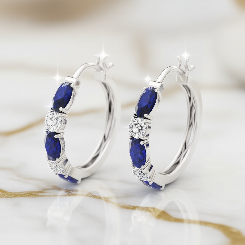 E2408 Women's White Gold Diamond Earrings With Sapphire Round Brilliant Cut Natural GIA Certified Wedding Classic Style