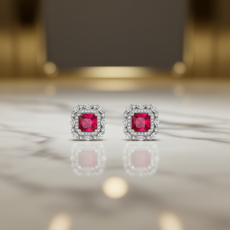 E2470 White Gold Ruby Stud Earrings Geometric Claw Setting Classic Women's Fine Jewelry