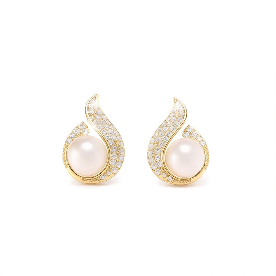 E2483 Gold Pearl Stud Earrings With Round Brilliant Cut Diamonds Water Drop Shape Bezel Setting For Women Wedding Luxury