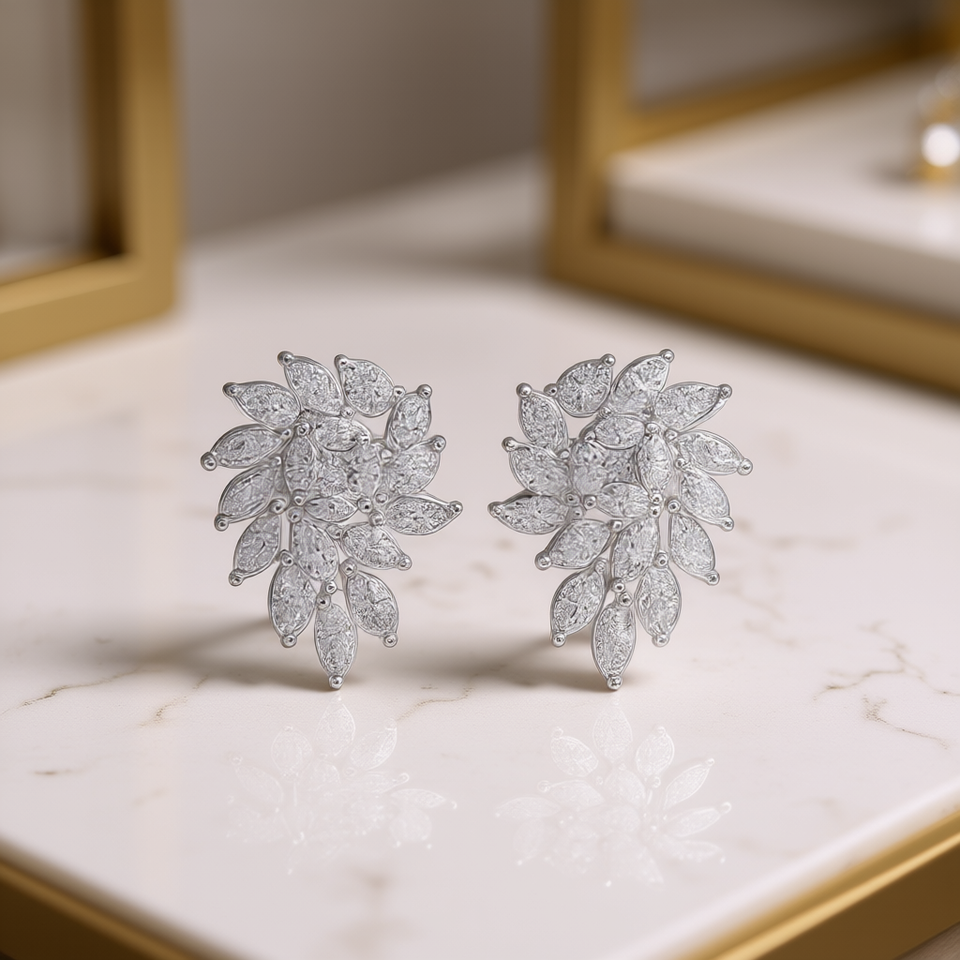 E2522 White Gold Flower Stud Earrings Marquise Cut Zircon Claw Setting Women's Wedding Romantic Fashion Jewelry