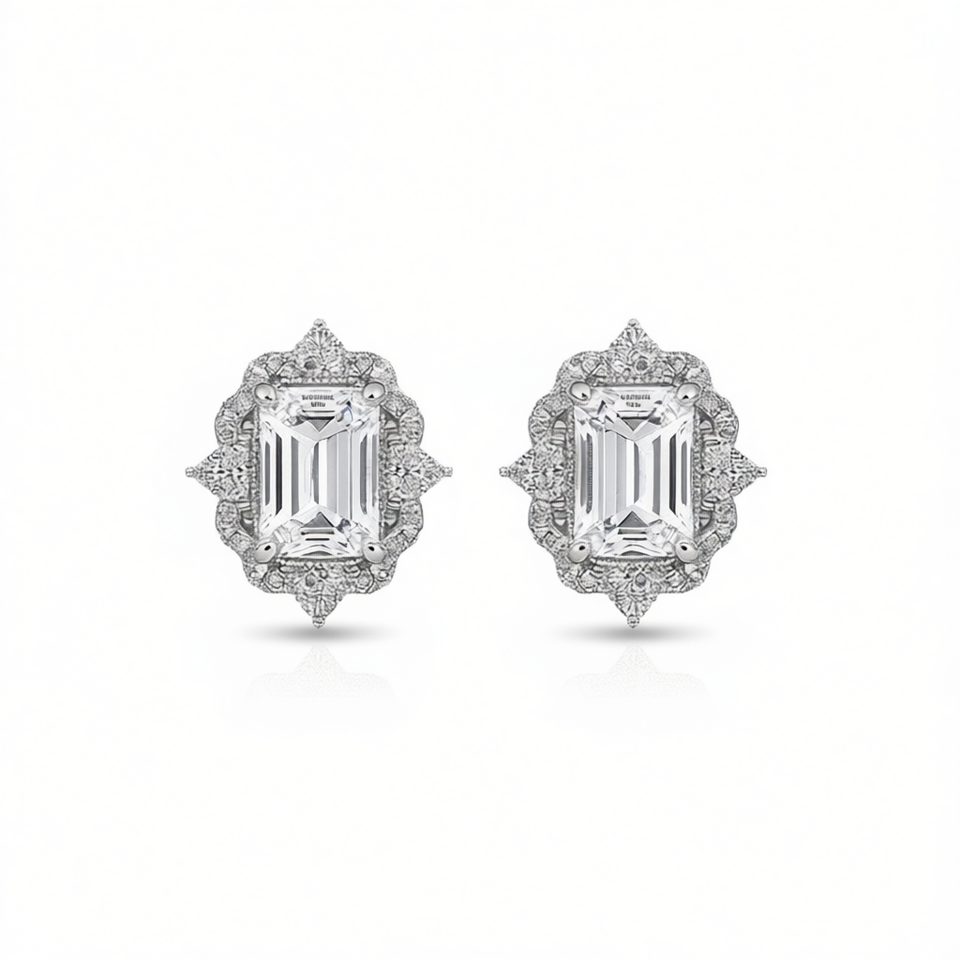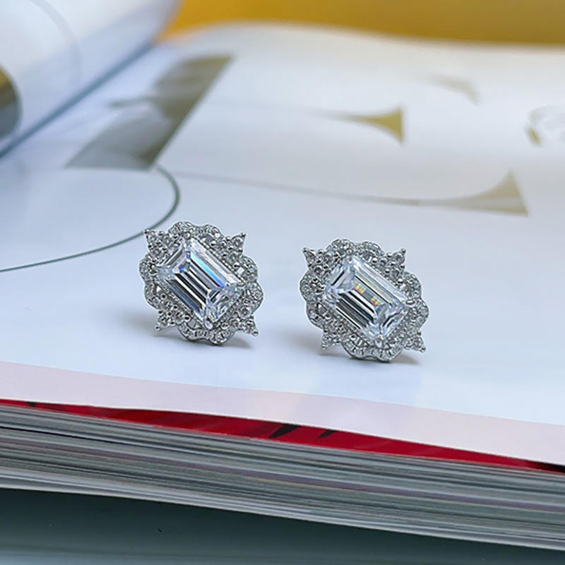 Orecchini a lobo E2610 in oro bianco con diamante taglio smeraldo, gioielli classici da donna, montatura a griffe a forma di stella