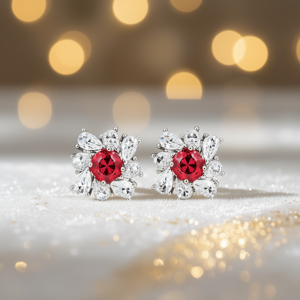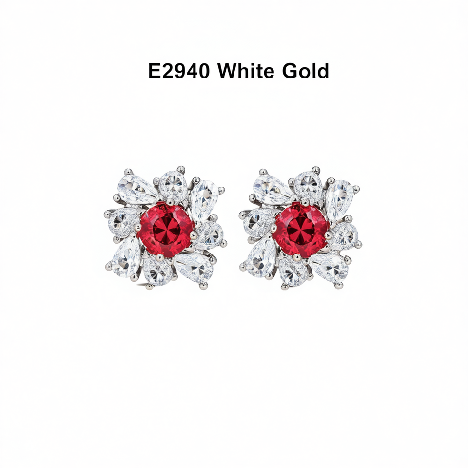 E2940 White Gold Ruby Stud Earrings Flower Design Claw Setting Women's Wedding Classic Crystal Jewelry