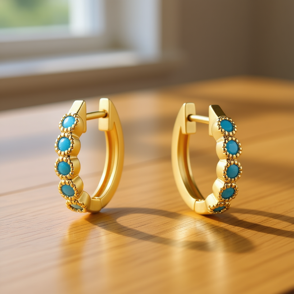 E3167 Golden Hoop Earrings With Turquoise Bezel Setting For Women Classic Style Alloy Jewelry