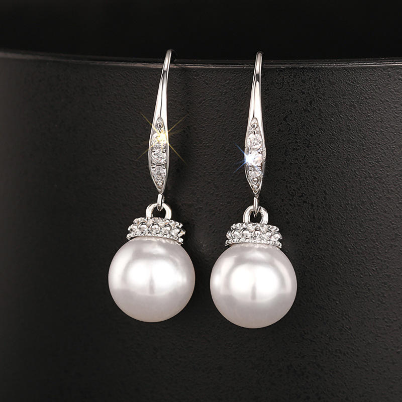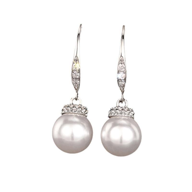 Orecchini Pendenti E3402 in Oro Bianco e Argento con Perle Finte a Forma di Sfera, Incastonatura Rotonda AAA, Gioielli Classici da Sposa per Donne