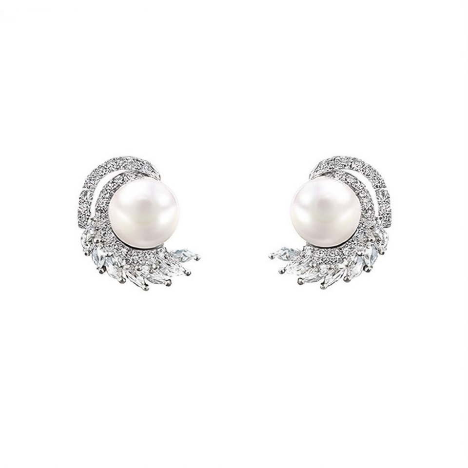 E3467 White Gold Modern Stud Earrings with Imitation Pearl and Marquise Cut Diamonds Flower Design Wedding Women's Jewelry