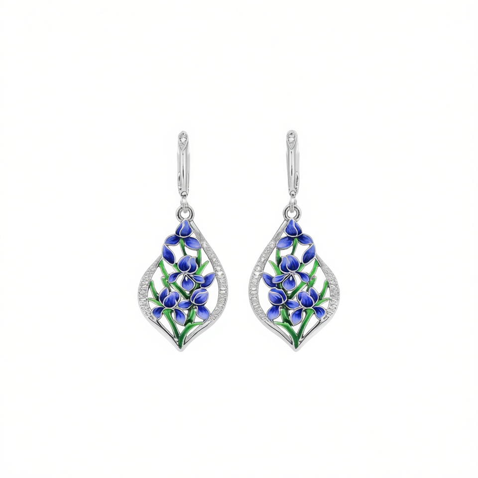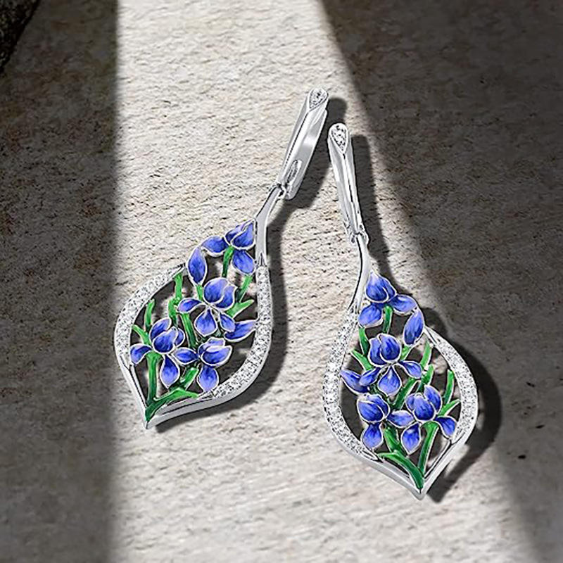 Orecchini pendenti in oro bianco E3478 con design floreale blu per donna, gioielli da festa, stile romantico, lega, cristallo, strass