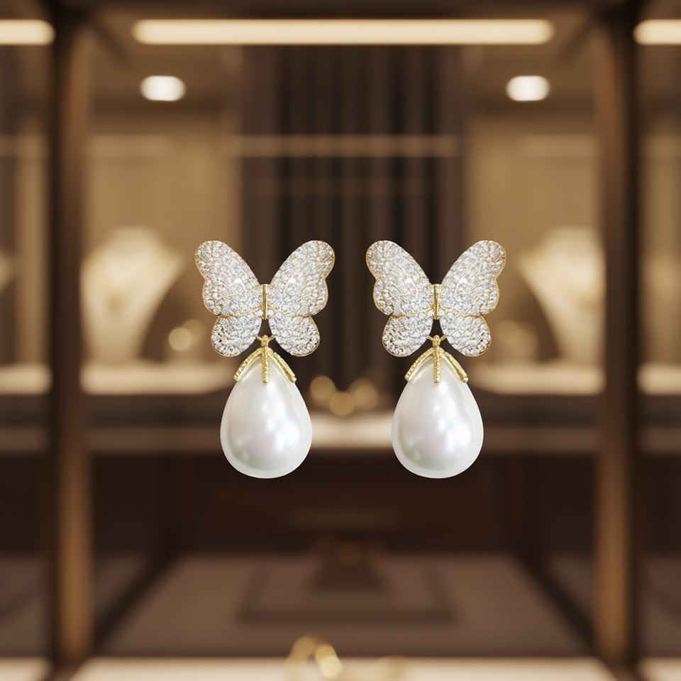 E3548 Golden Butterfly Drop Earrings With White Baroque Cultured Pearl AAA Grade Gold Plated Women's Luxury Wedding Jewelry