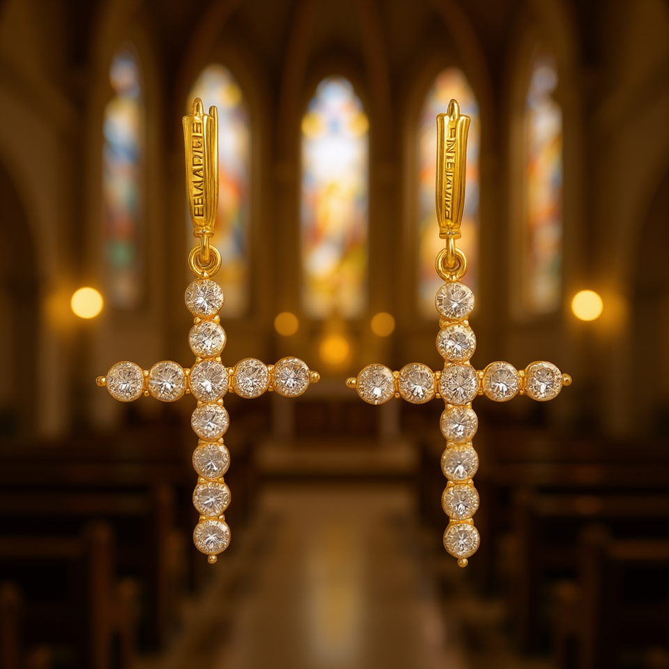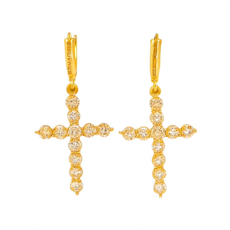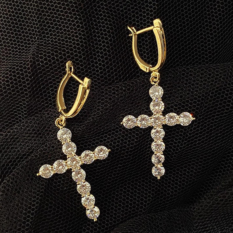 Orecchini pendenti a croce in oro E3567 con zirconi rotondi incastonati a griffe per donna, gioielli religiosi alla moda