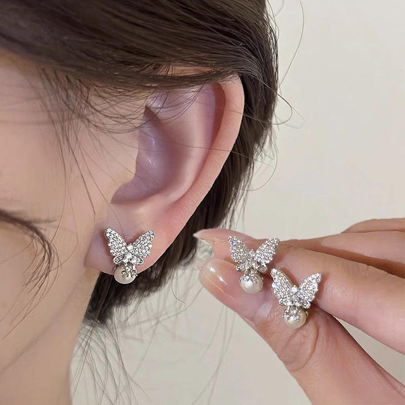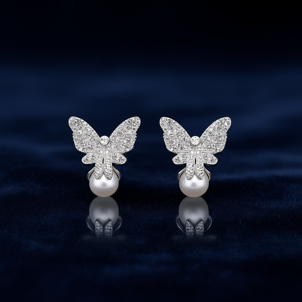 E3629 White Gold Butterfly Stud Earrings With Imitation Pearl And Round Brilliant Cut Diamonds For Women Party Romantic Style