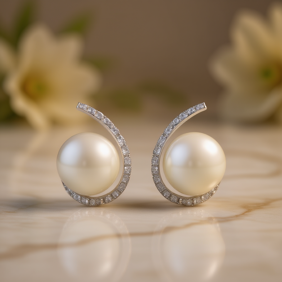 E3651 White Gold Pearl Earrings With Round Brilliant Cut Natural Diamonds For Wedding Women's Classic Style