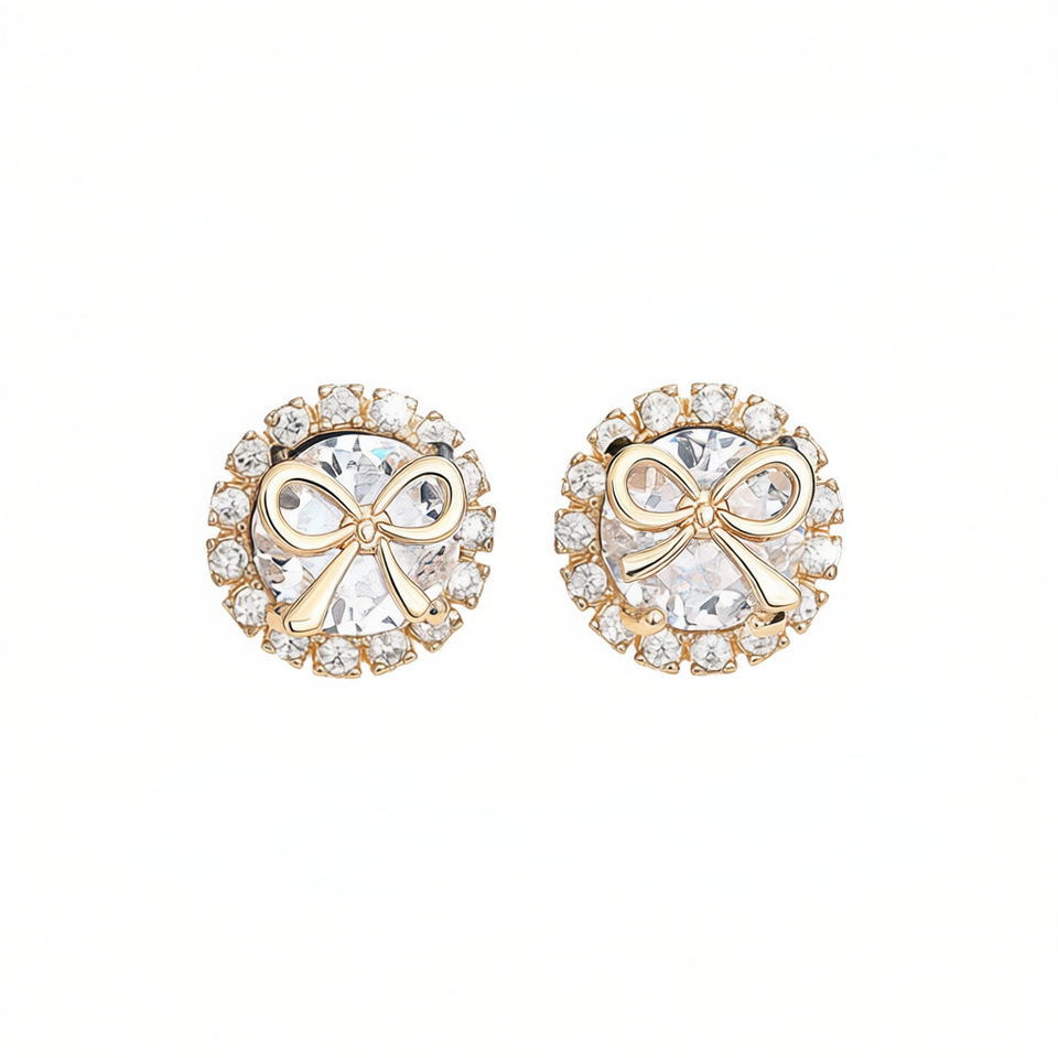 E3682 Golden Crystal Stud Earrings Bowknot Design Women's Everyday Wear Zinc Alloy Bezel Setting Cute Jewelry