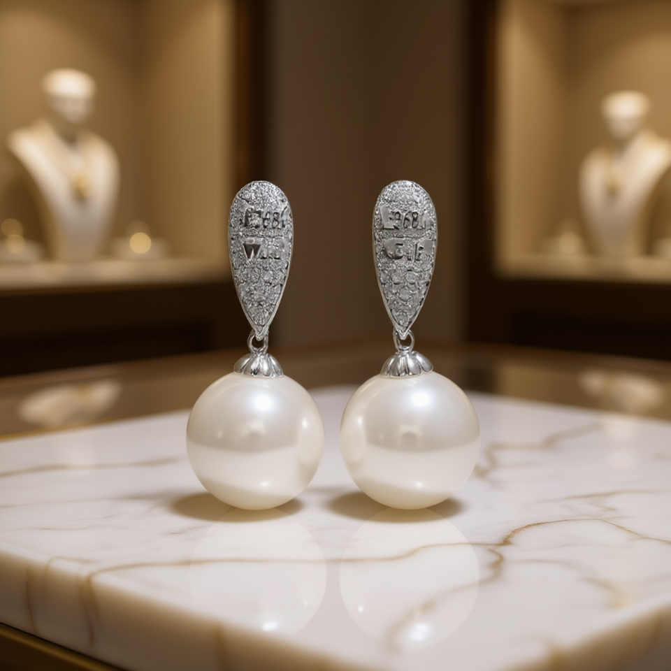 Orecchini Pendenti E3686 in Oro Bianco con Perle Coltivate, Forma Rotonda AAA, Gioielli da Sposa per Donna, Placcati in Oro 18K con Micro Incastonatura