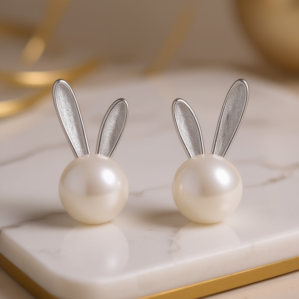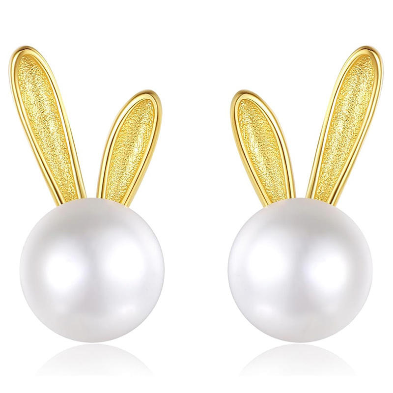 E3703 Golden Pearl Stud Earrings Women's Cartoon Rabbit Shape Faux Pearl AAA Round Silver Plated Everyday Wear Cute Jewelry