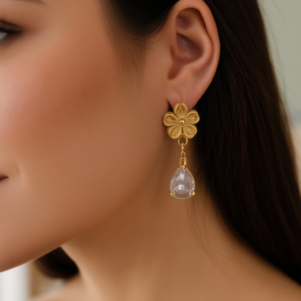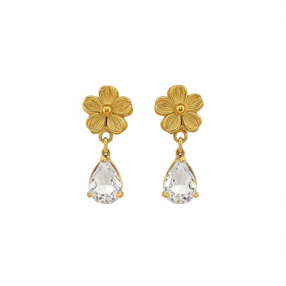 Orecchini Pendenti E3760 con Fiore Dorato e Cristallo Taglio a Pera, Gioielli Classici da Donna per Feste