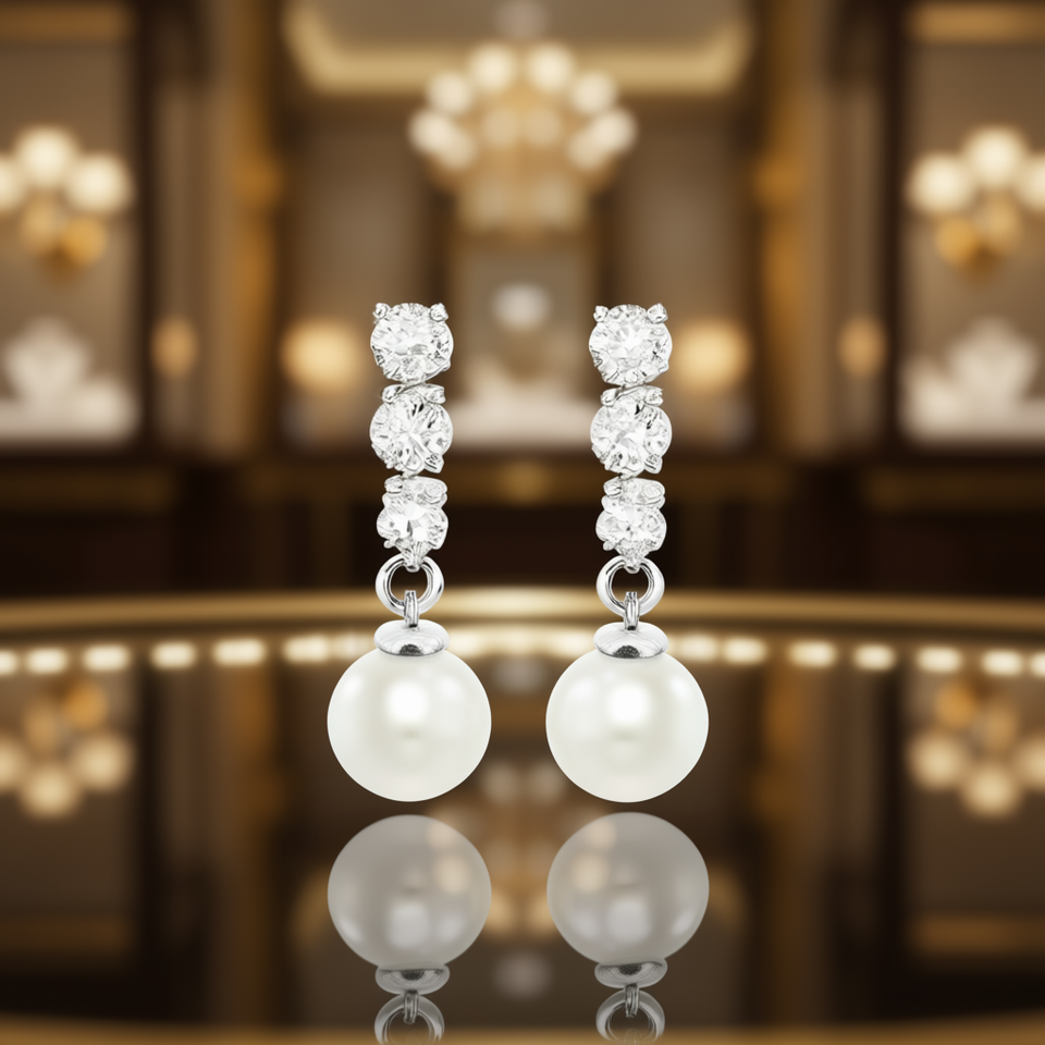 E3947 Orecchini pendenti in oro bianco con diamanti rotondi taglio brillante e perle imitate, gioielli da sposa classici da donna