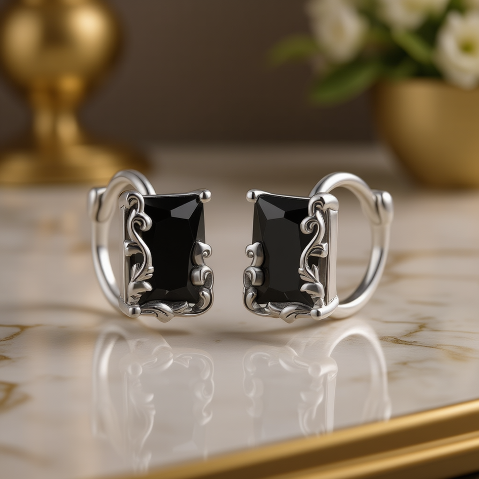 E4158 White Gold Hoop Earrings With Onyx Bezel Setting Vintage Style Women's Fine Jewelry