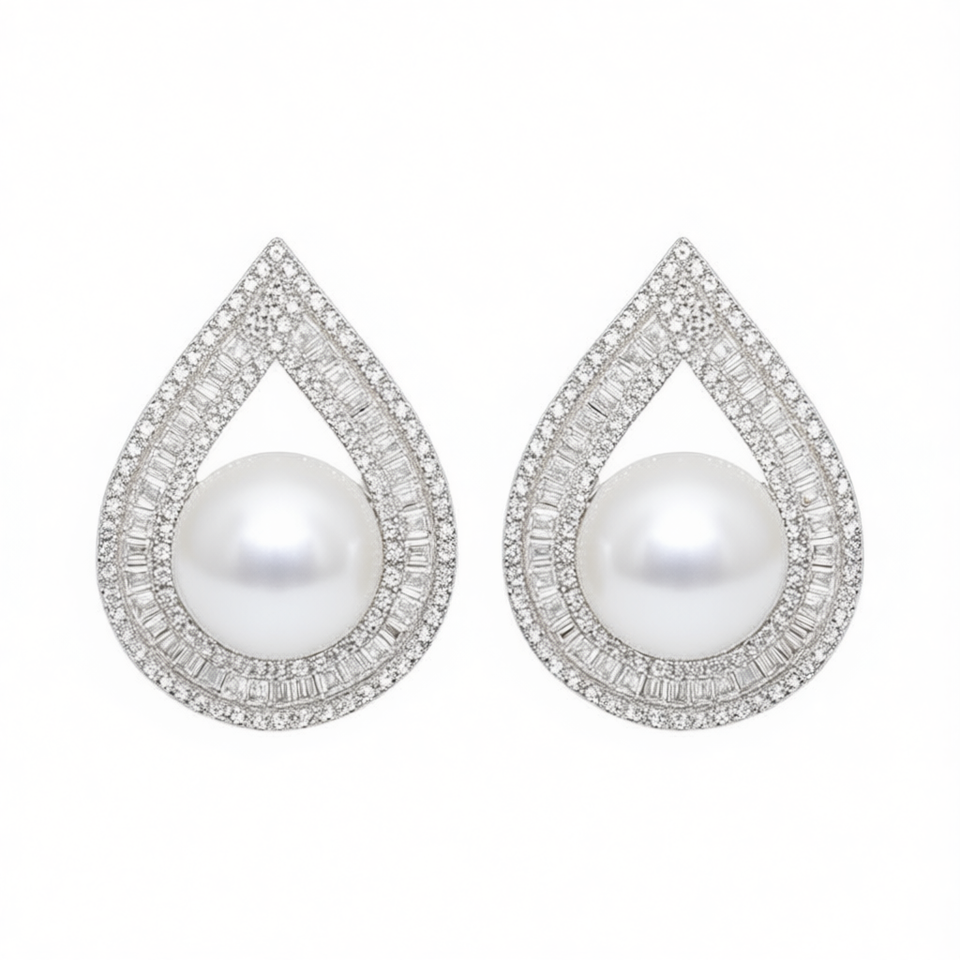 E4186 Orecchini pendenti in oro bianco con perle imitate, taglio baguette, montatura a pavé, a forma di goccia d'acqua, gioielli da sposa da donna