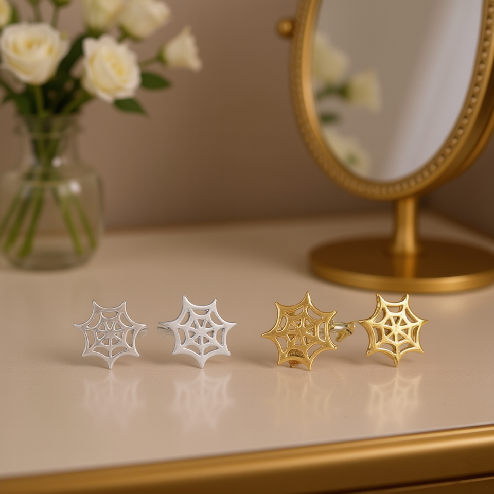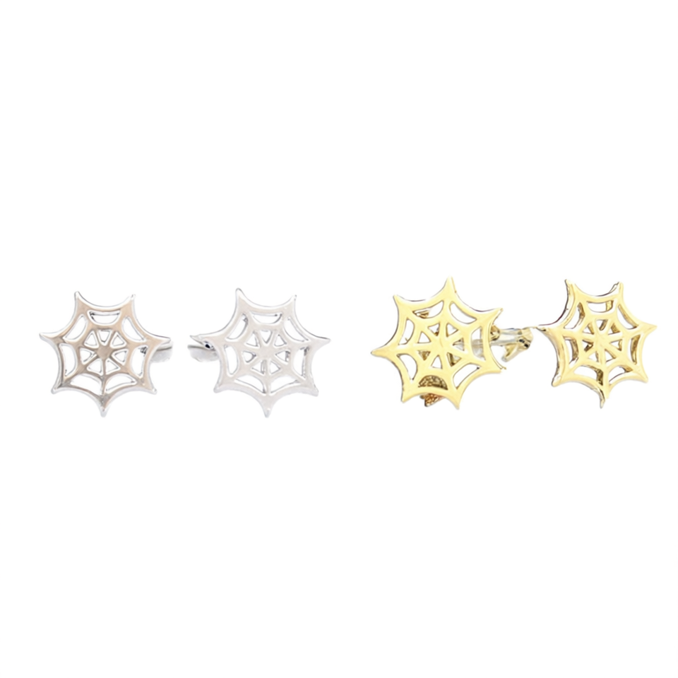 E4316 Orecchini a Perno a Forma di Ragnatela in Oro Bianco, Gioielli Unisex di Tendenza dal Design Moderno