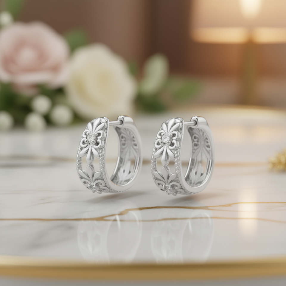 E4485 White Gold Hoop Earrings With Diamond Flower Design Claw Setting Women's Classic Fine Jewelry