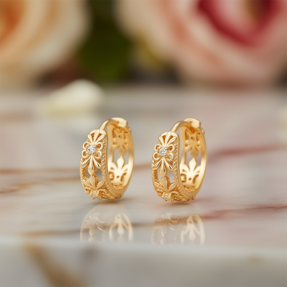 E4486 Golden Hoop Earrings Women's Classic Flower Design Diamond Round Brilliant Cut Gold Plated Everyday Wear