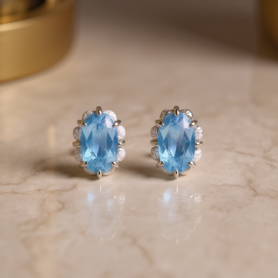 E4625 Sky Blue Gemstone Oval Cut Stud Earrings White Gold Claw Setting Classic Women's Everyday Wear