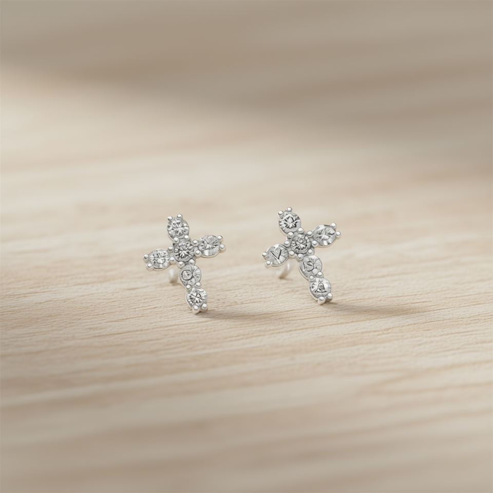 E4751 White Gold Cross Stud Earrings With Round Zircon Claw Setting Women's Religious Fashion Jewelry