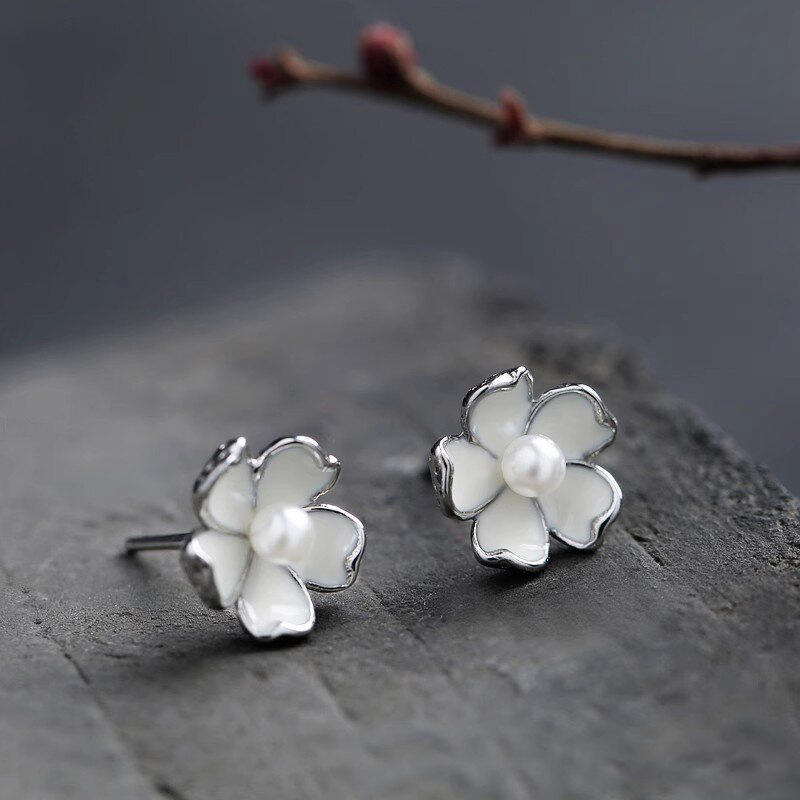 E4811 White Gold Flower Stud Earrings With Faux Pearl Bezel Setting Women's Classic Everyday Wear Jewelry