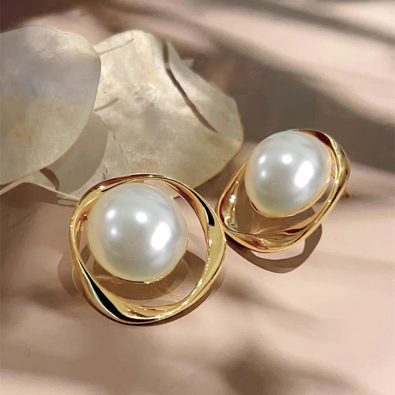 E4850 Golden Stud Earrings With Freshwater Pearl Bezel Setting Geometric Design For Women's Everyday Wear