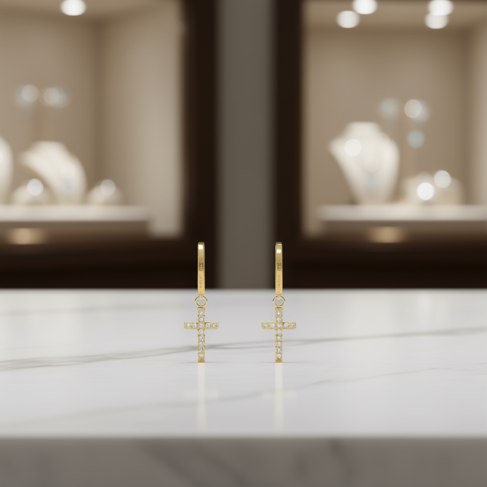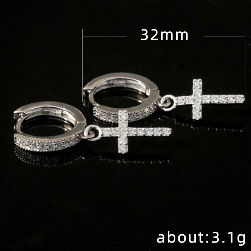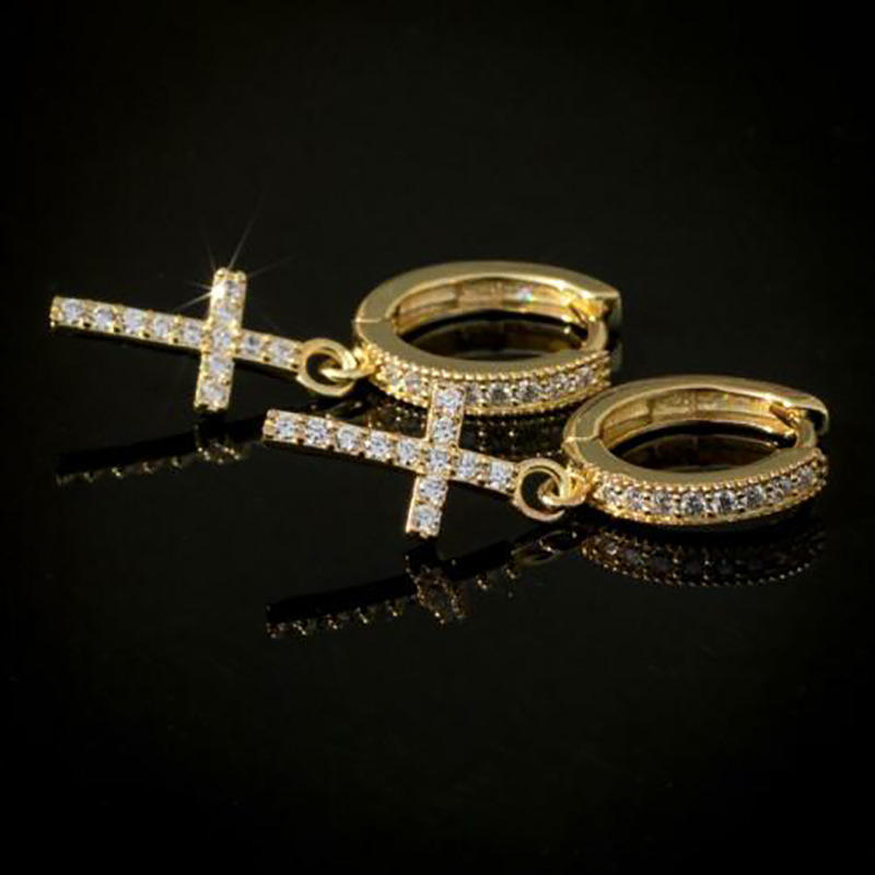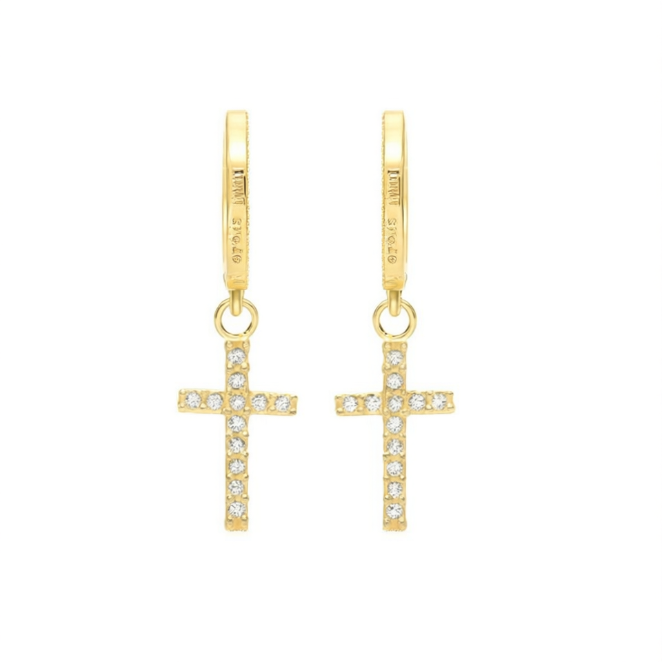 E643 Gold Cross Hoop Earrings Pave Crystal Religious Unisex Everyday Wear
