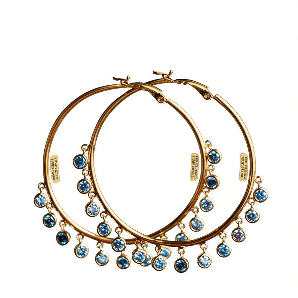 Orecchini a Cerchio E770 in Oro con Nappe di Cristallo Blu, Stile Bohémien, Gioielli da Donna per Uso Quotidiano