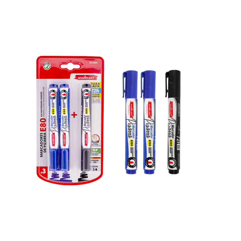 E80 3U Whiteboard Marker Set 2 Blue and 1 Black Dry Erase Ink Plastic Material for School Use