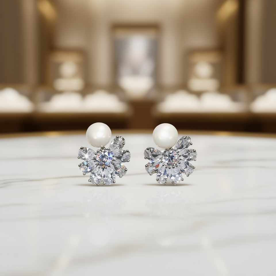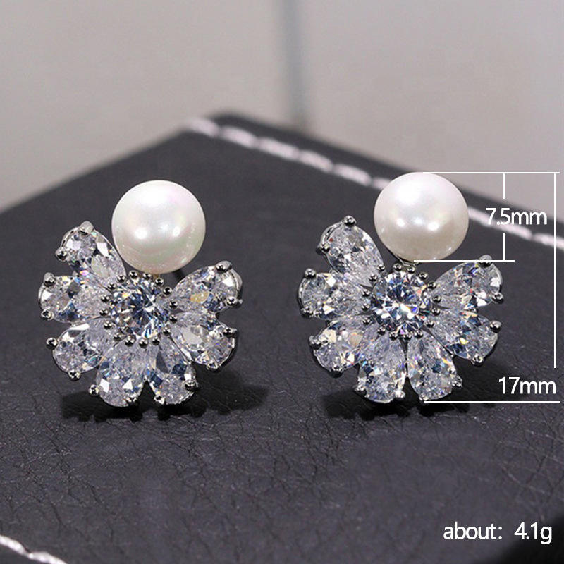 E983 White Gold Flower Stud Earrings With Imitation Pearl And Round Brilliant Cut Diamonds For Wedding Women's Romantic Style