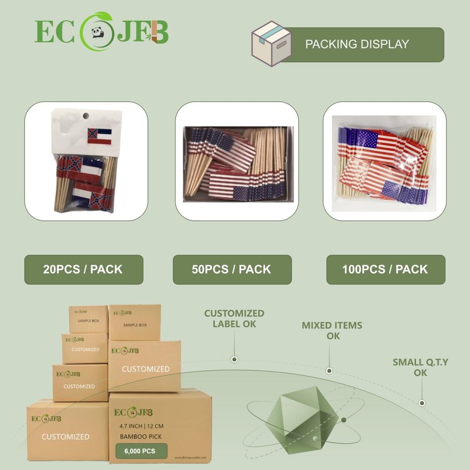 ECO JFB 2025 OEM forma personalizzata Logo stampato stecchino bandiera bastoncini festa in legno picconi compleanno decorazione stuzzicadenti 65mm