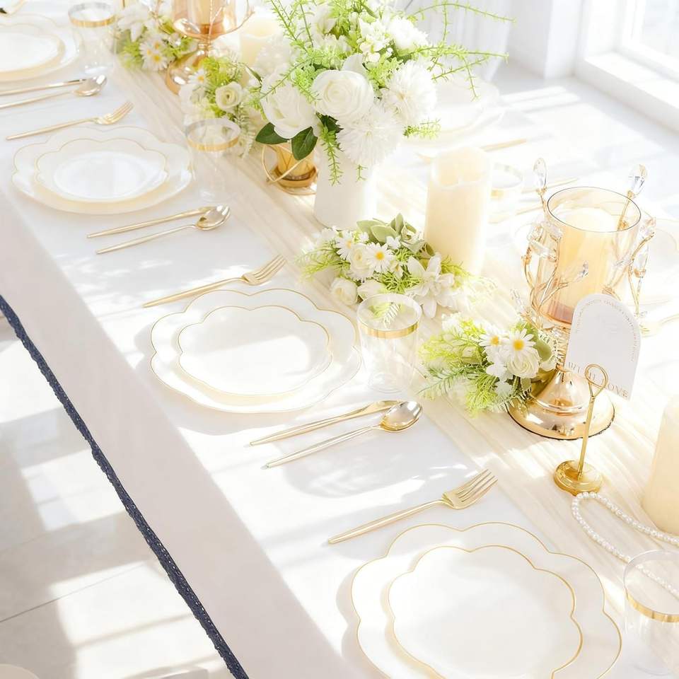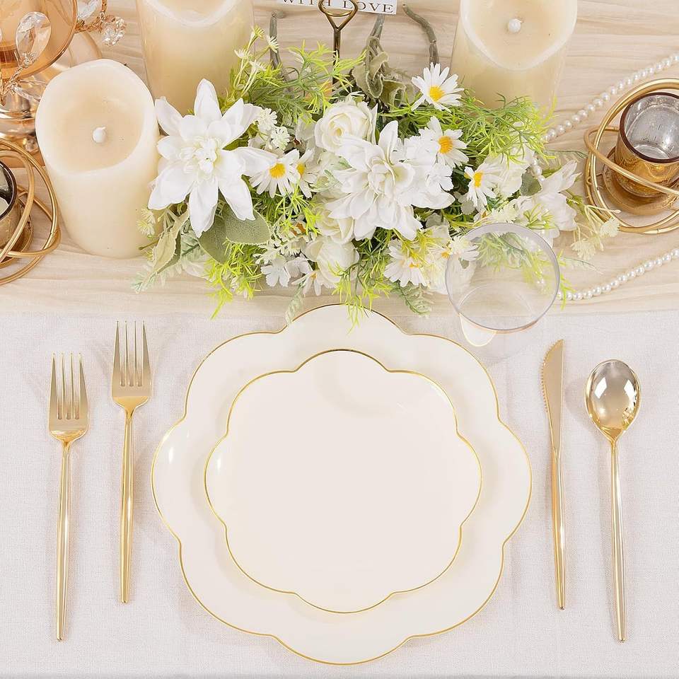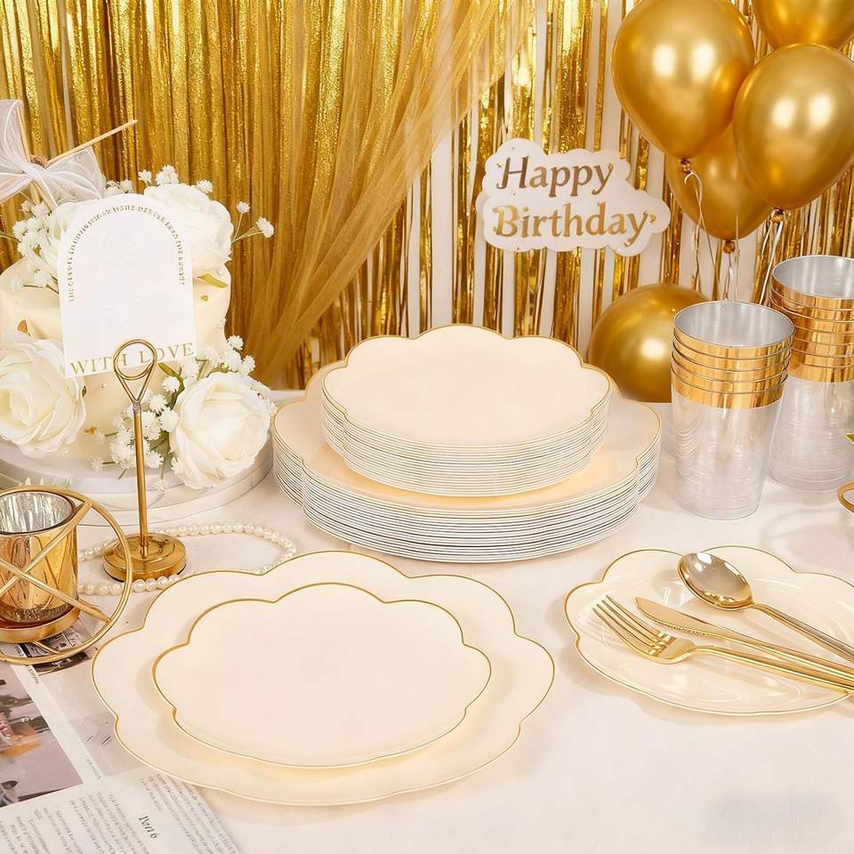 EI 180pcs Beige Plastic Dinnerware Set 30 Heavy-Duty Disposable Party Plates with Gold Plastic Silverware for Parties