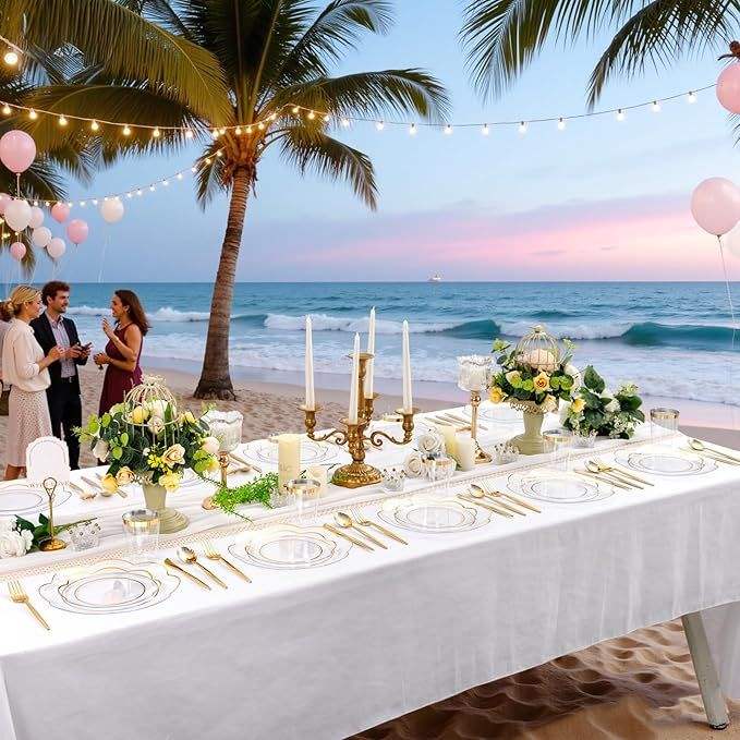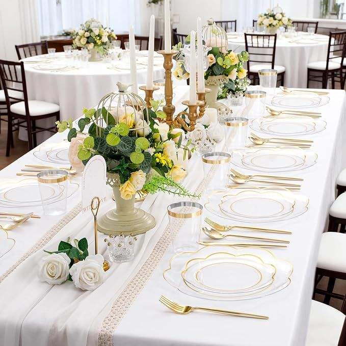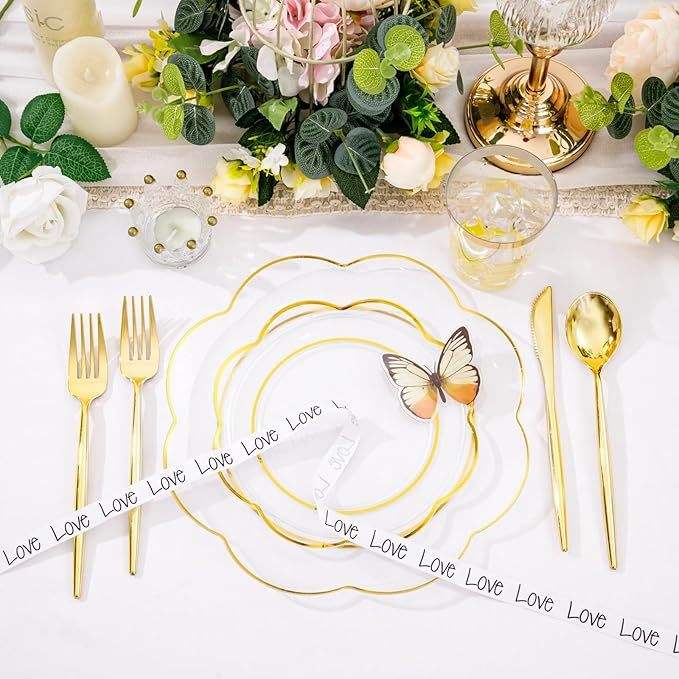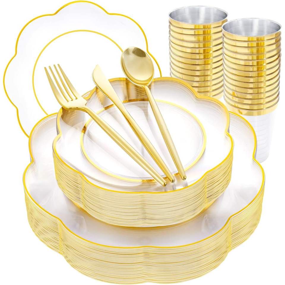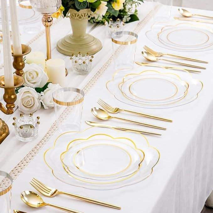 Set di stoviglie in plastica trasparente EI da 180 pezzi, resistente, con posate oro e argento per matrimoni e feste