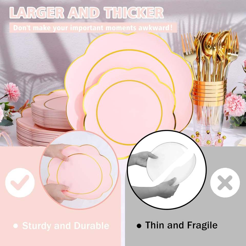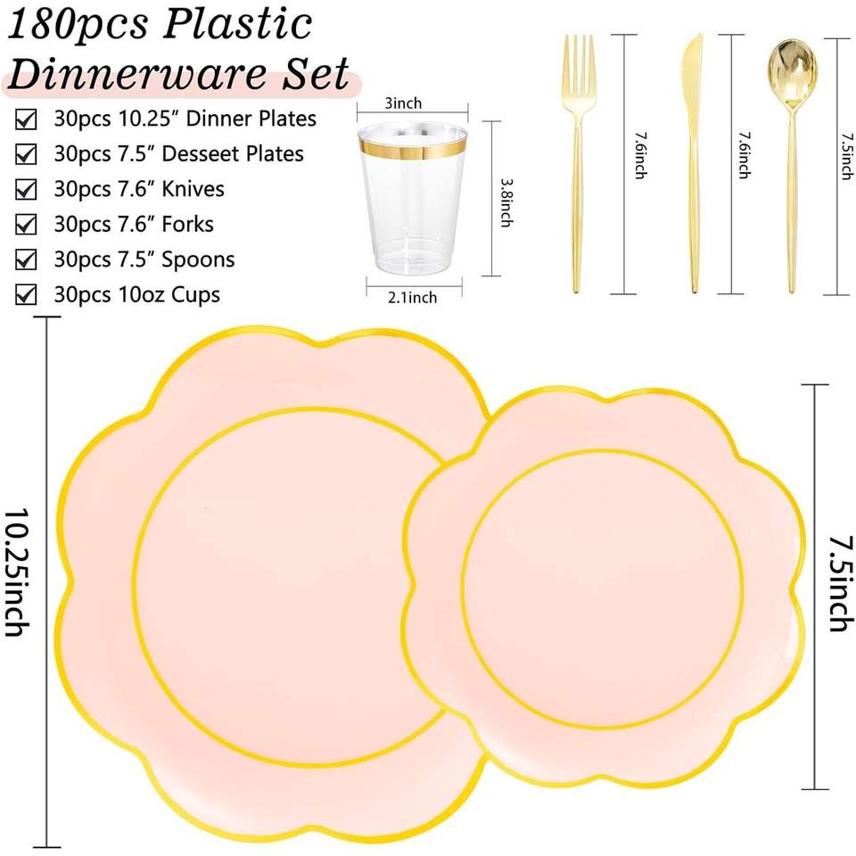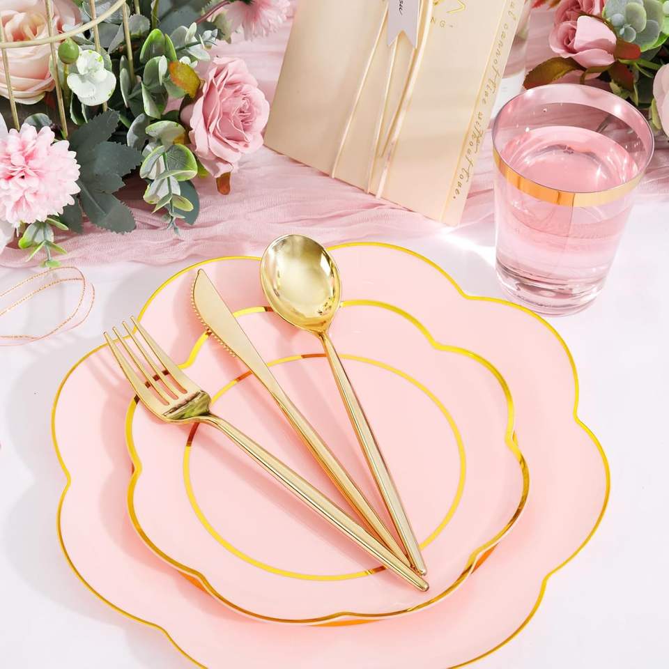 Set di 180 Piatti di Plastica Rosa Usa e Getta Resistenti con Posate Dorate e Argentate, Stoviglie Bianche per 30 Persone, Decorazioni per Feste