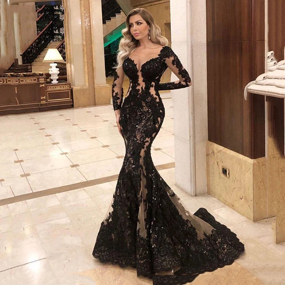 EV110 Sweetheart Black Lace Appliques Nude Tulle Mermaid Prom Dress Plus Size Formal Evening Celebrity Dresses Custom Made