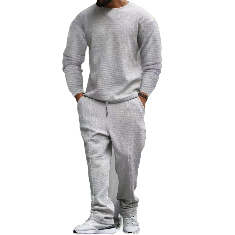 EVELYN Men's Casual Sports Two-Piece Suit Knitted Waffled Crewneck Long Sleeve T-Shirt and Trousers for Winter