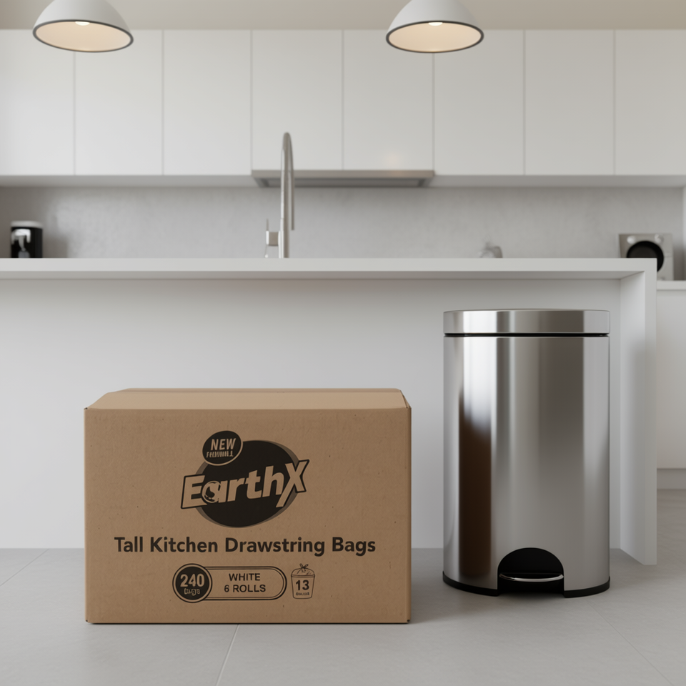 Sacchetti per la Spazzatura EarthX con Cordoncino, 13 Galloni, Bianchi, 240 Pezzi, Senza Profumo, Prodotti negli Stati Uniti