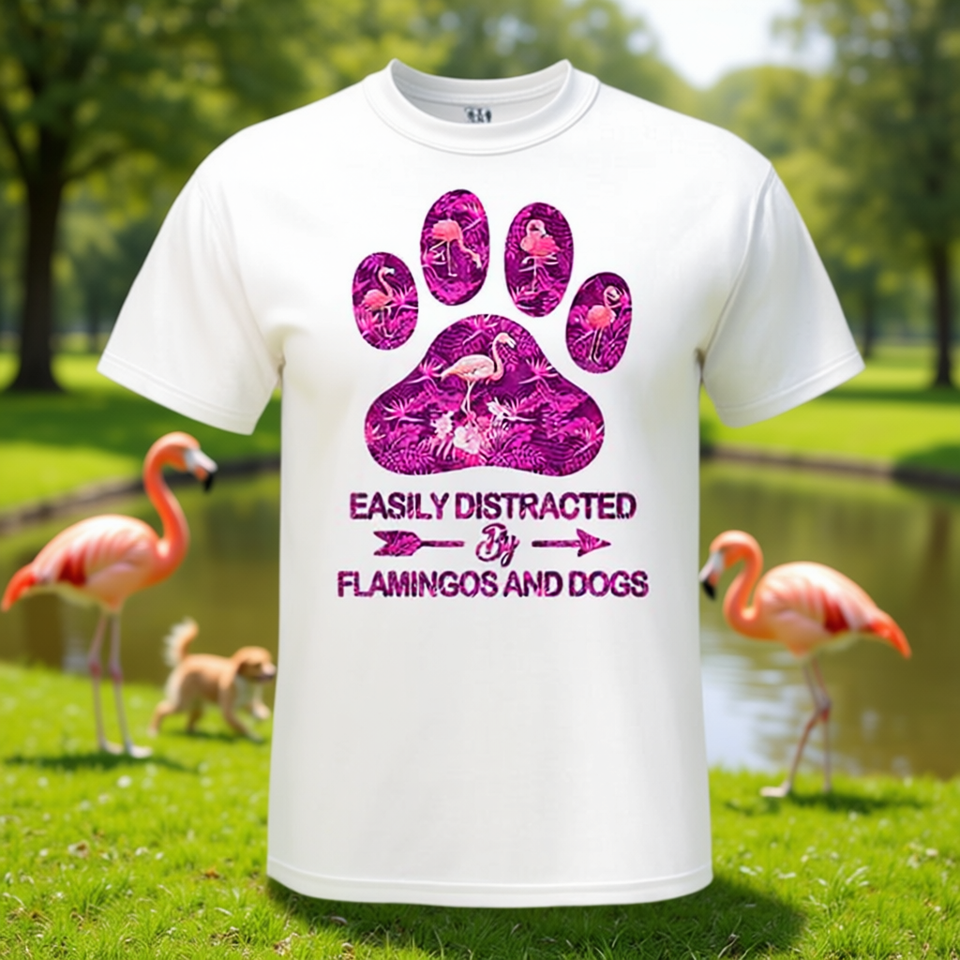 T-shirt con stampa digitale a maniche corte unisex con design a zampa rosa, modello 'Facilemente distratto da fenicotteri e cani', taglie per adulti dalla S alla XXL