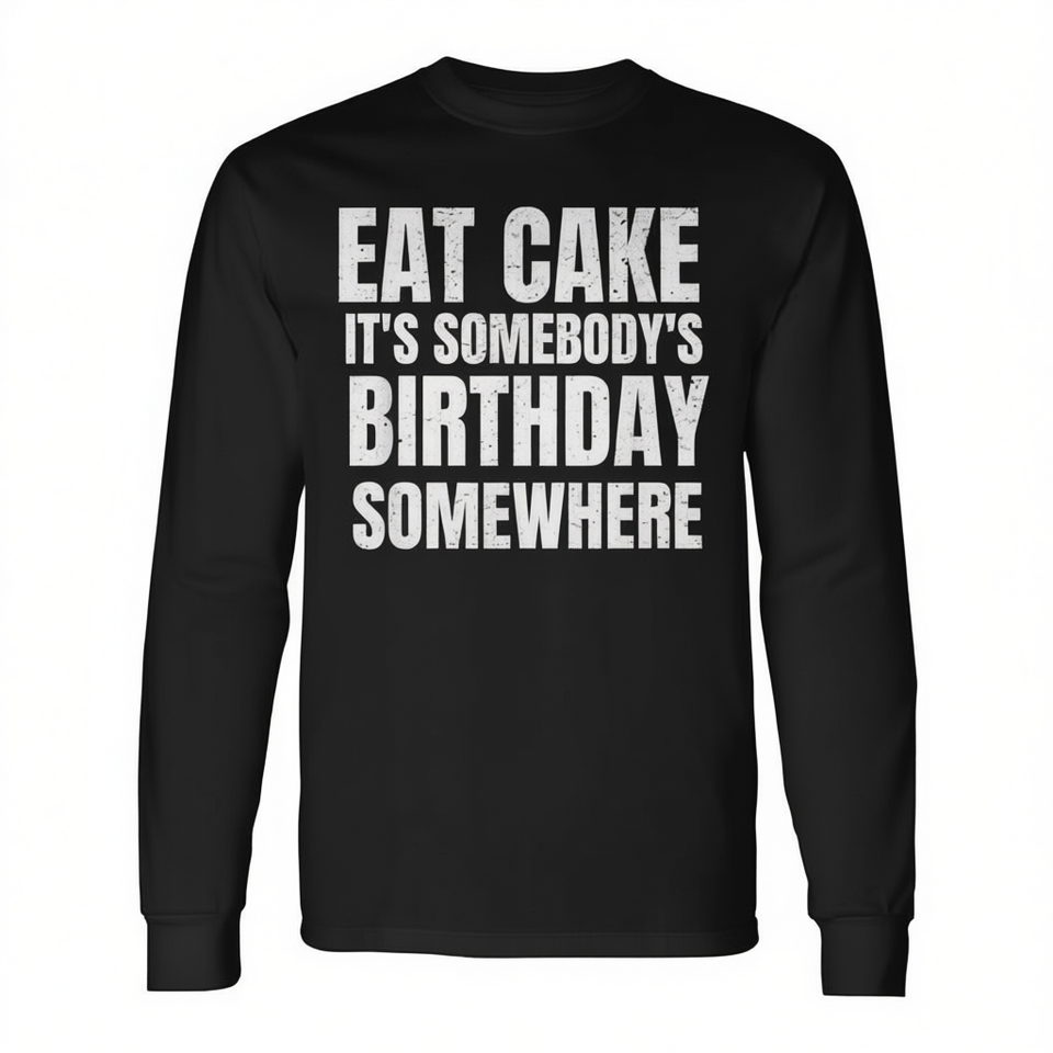 T-shirt a maniche lunghe con stampa serigrafica 'Eat Cake Its Somebodys Birthday Somewhere' per adulti, unisex, girocollo