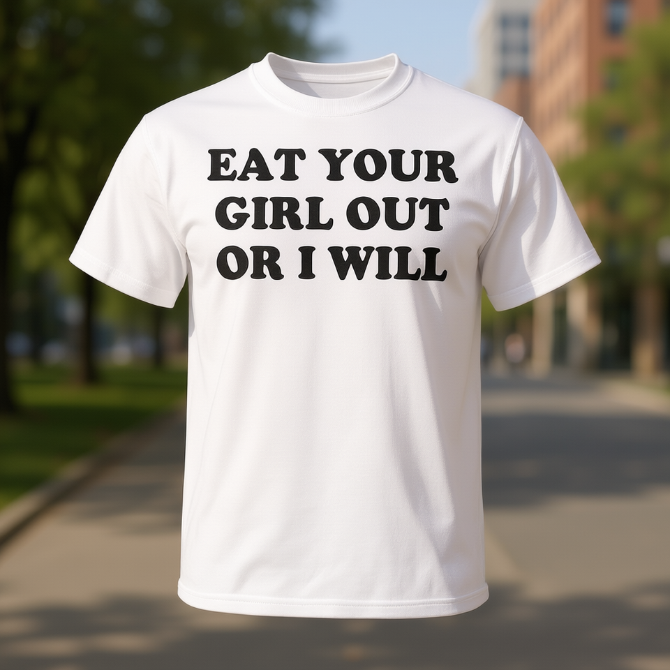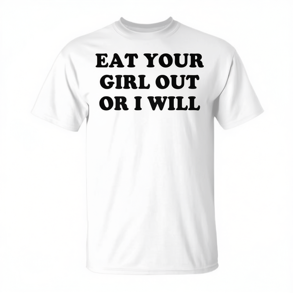 T-shirt promozionale bianca unisex per adulti con scritta 'Eat Your Girl Out Or I Will'