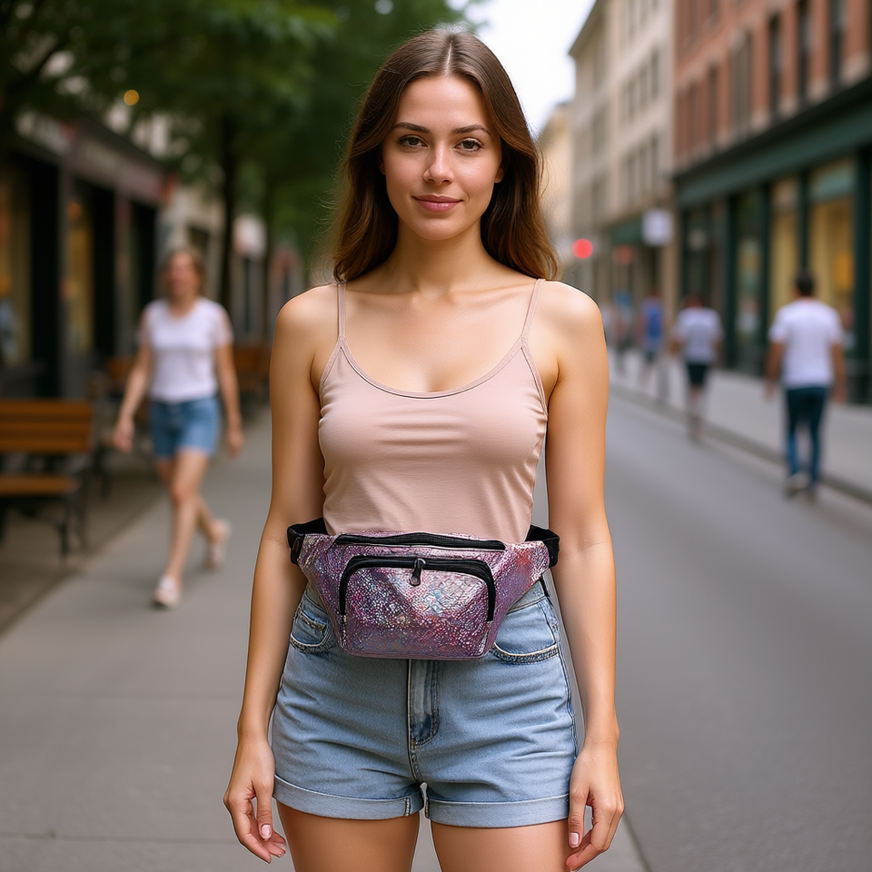Eb Women's Fanny Pack Waist Bag Metallic Multiple Pockets Zip Closure All Seasons Travel Outdoor Party Use