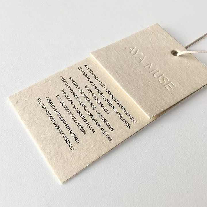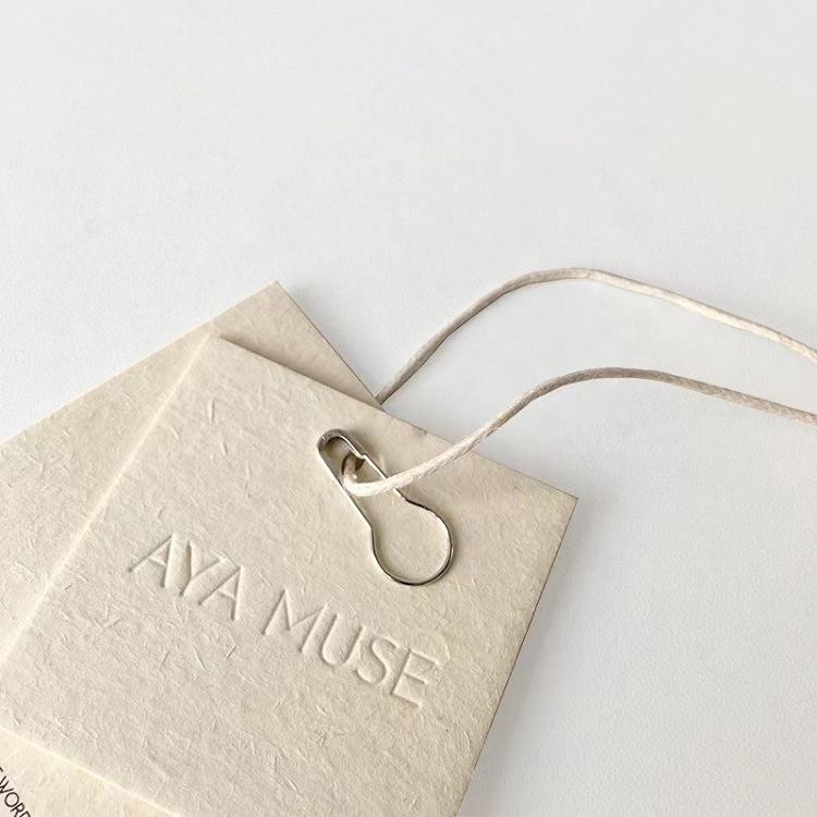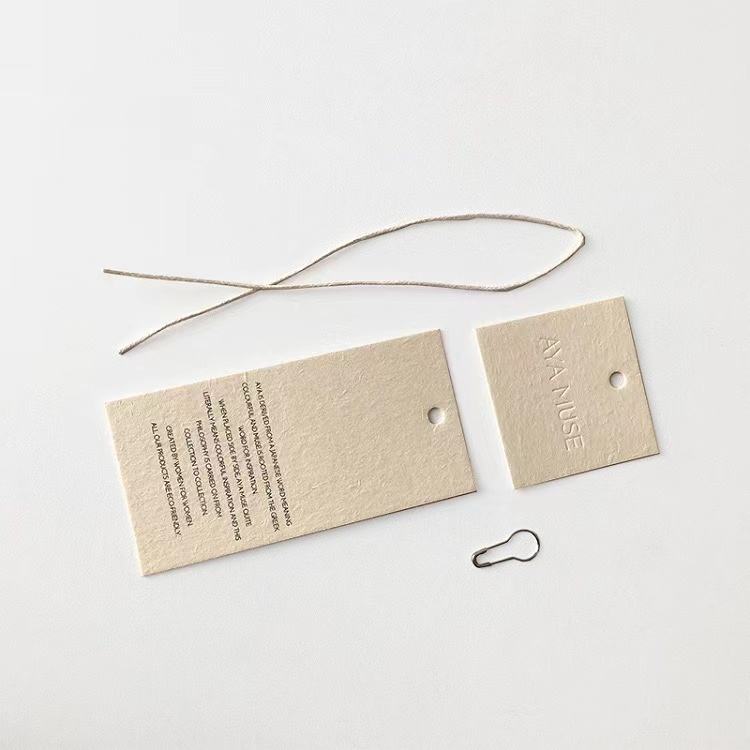 Etichette Pendenti Ecologiche in Carta Speciale con Logo Goffrato e Stampato, con Cordino e Spilla di Sicurezza per Abbigliamento