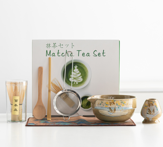 Set da tè in Matcha con motivo a spirale a otto pezzi Set da tè e caffè testurizzato con frusta a coste e utensili per la preparazione tattile