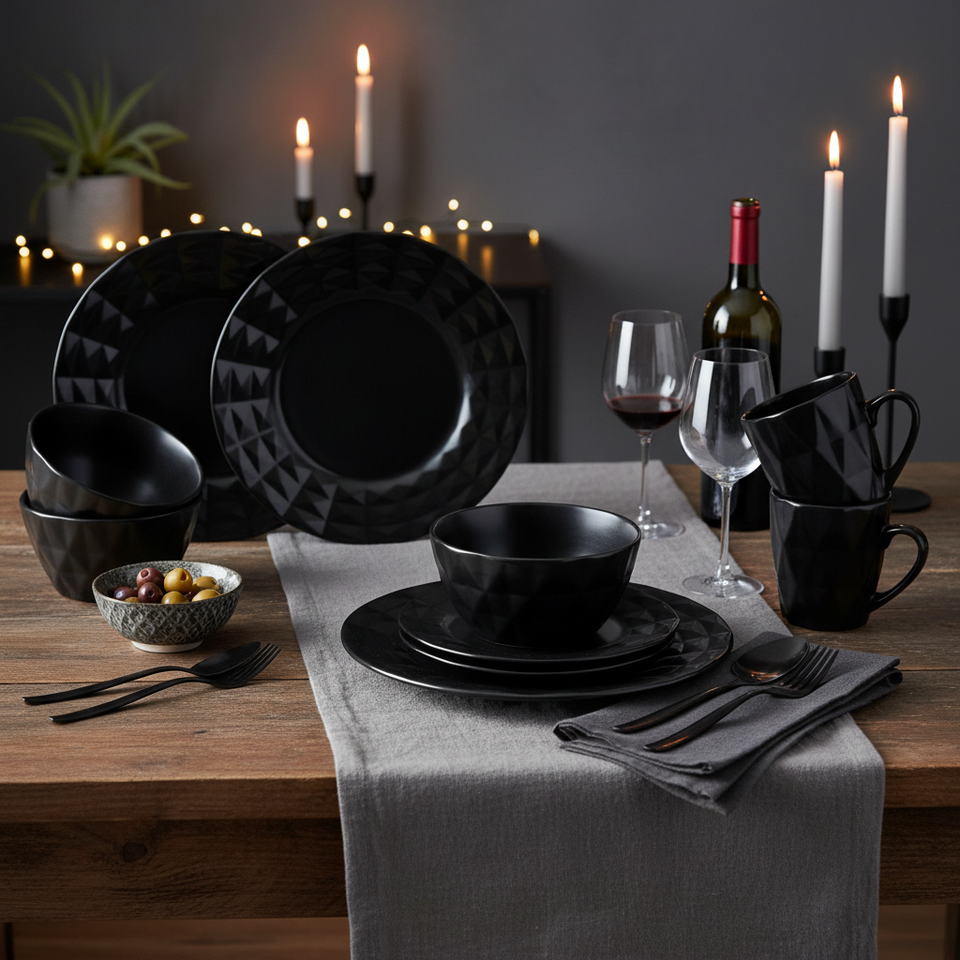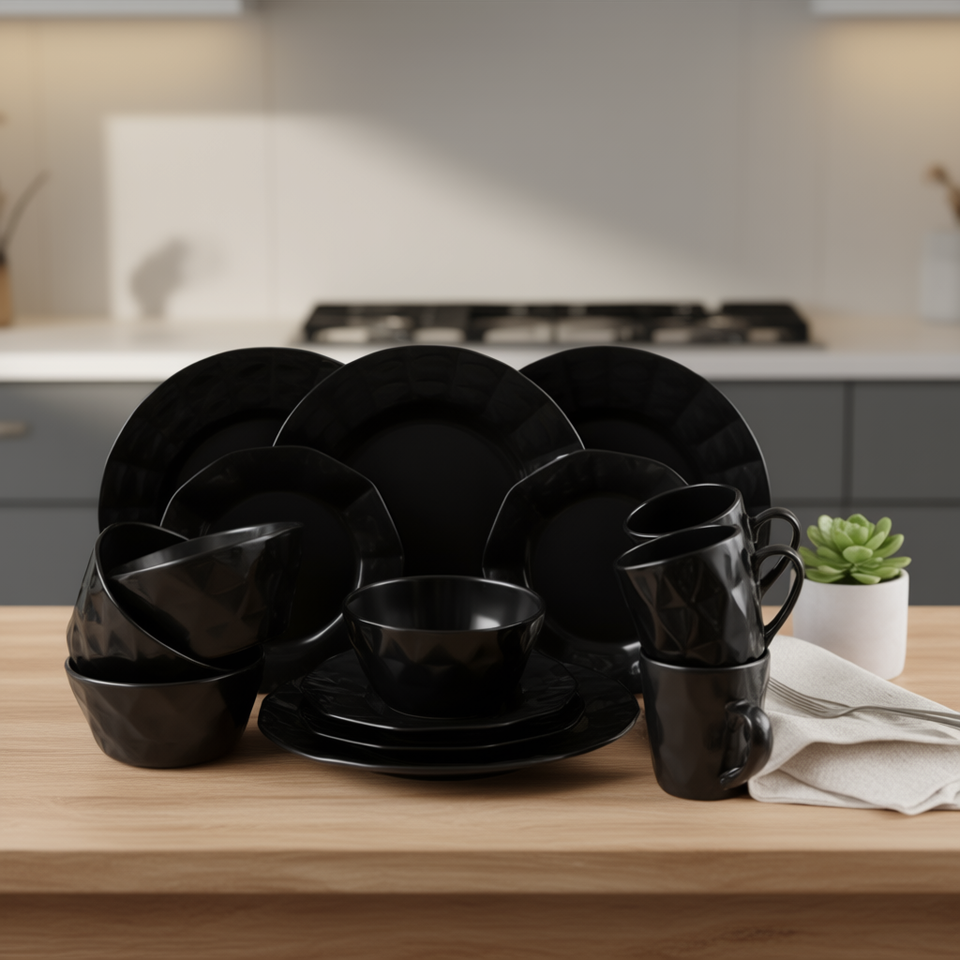 Set di Stoviglie Smaltate Elama Retro Chic da 16 Pezzi, Nero, Lavabile in Lavastoviglie, per Feste