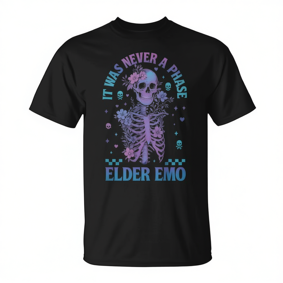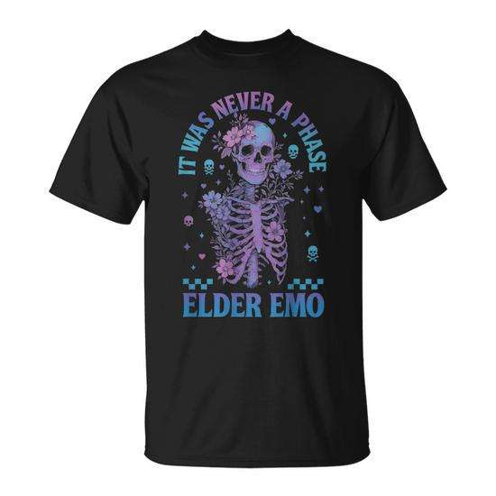 T-shirt Elder Emo Club Skeleton IT Was Never A Phase con grafica dal design grafico, vestibilità unisex
