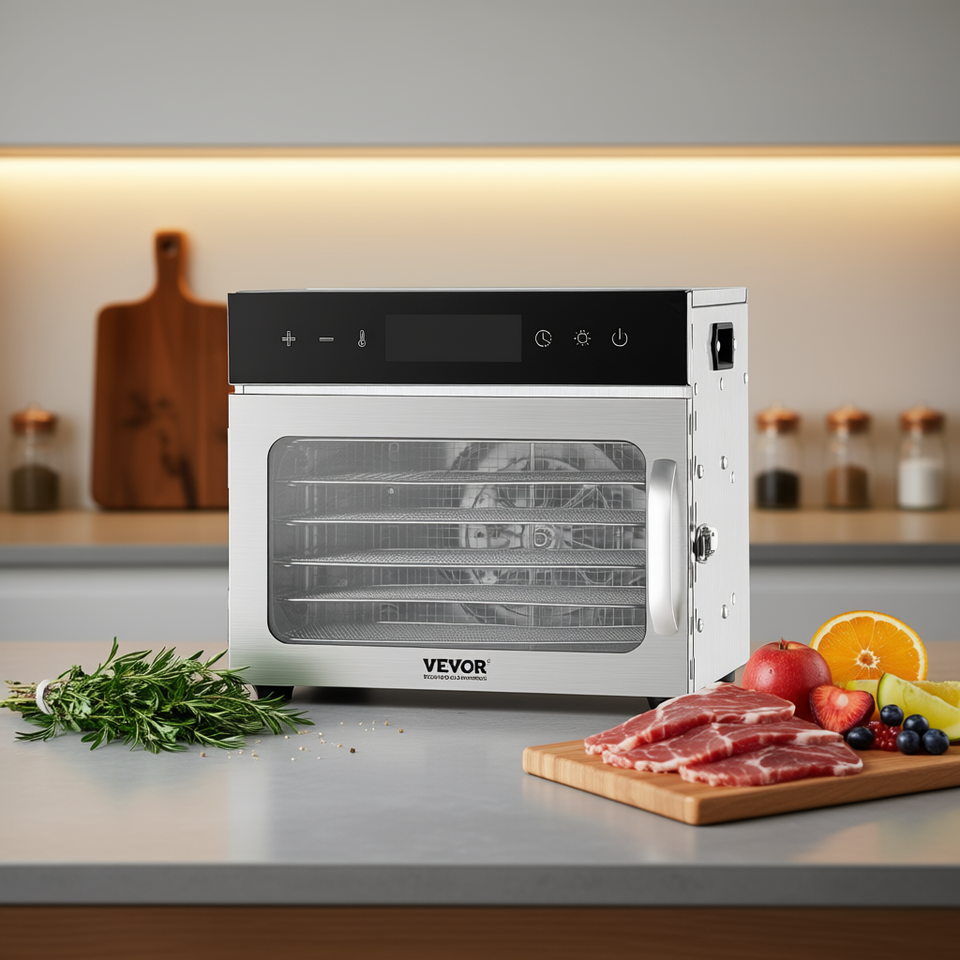 Essiccatore elettrico per alimenti a 6 ripiani, 400W, in acciaio inox, con timer e temperatura regolabili, per essiccare carne e altri alimenti.
