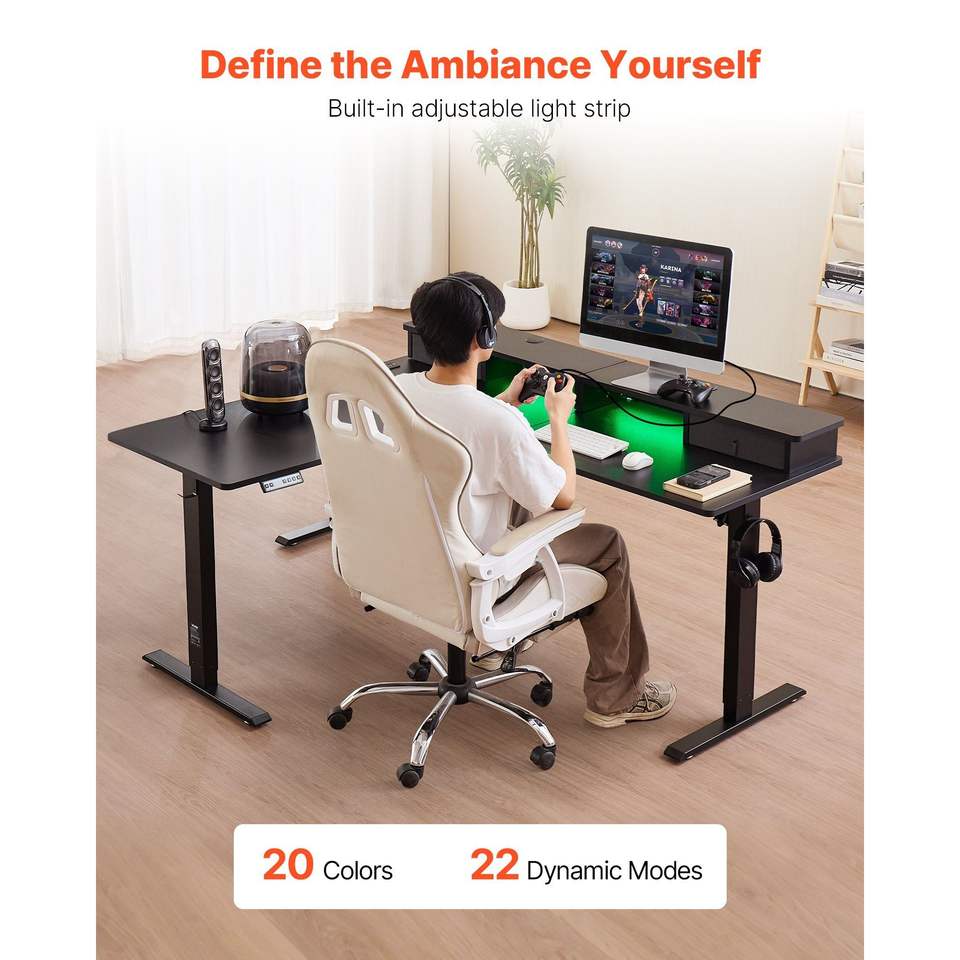Scrivania da Gaming Angolare a L Regolabile Elettricamente con Doppio Gancio, Cassetti in Tessuto, Supporto CPU e Vano Porta Accessori a T