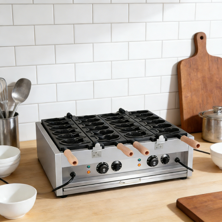 Macchina Elettrica per Taiyaki a Doppia Fila con 12 Stampi, 6kW, Acciaio Inossidabile, 50-300 ° C, per Chioschi di Cibo di Strada e Gelaterie